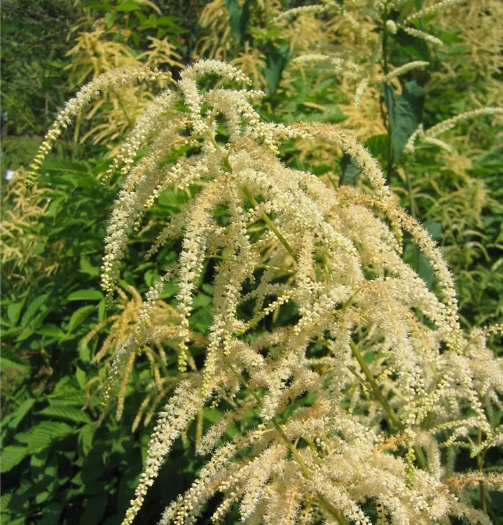 Aruncus dioicus bildet in Rispen angeordnete, weiße Blüten ab Juni.