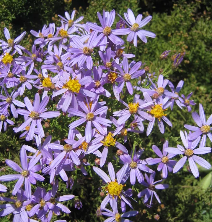 Aster sedifolius 'Nanus' bildet körbchenartige, in Dolden angeordnete, lilafarbene Blüten ab August. Diese verströmen einen angenehmen Duft.