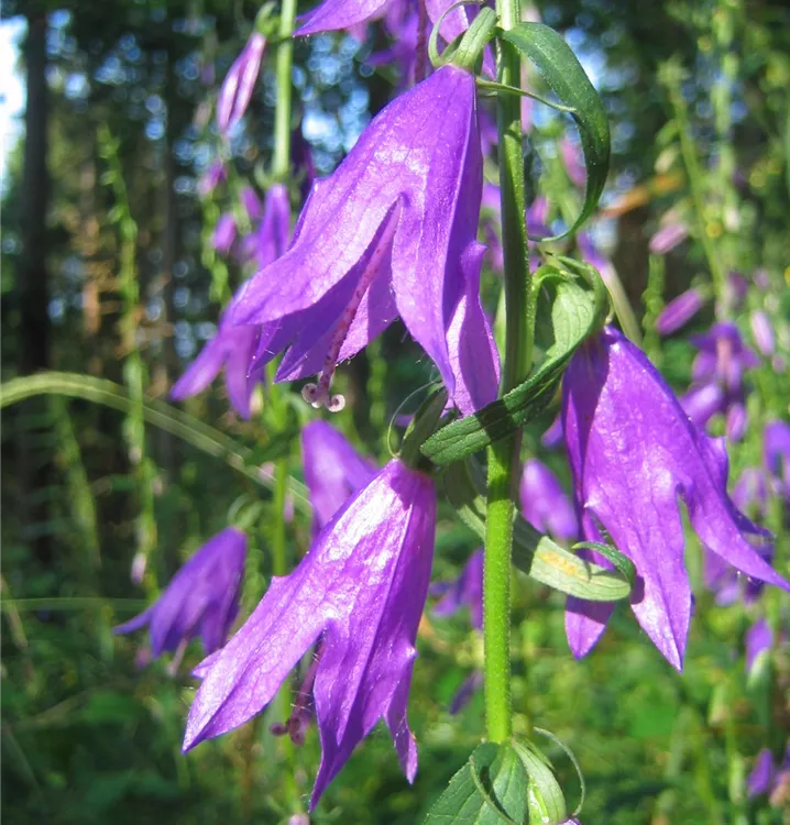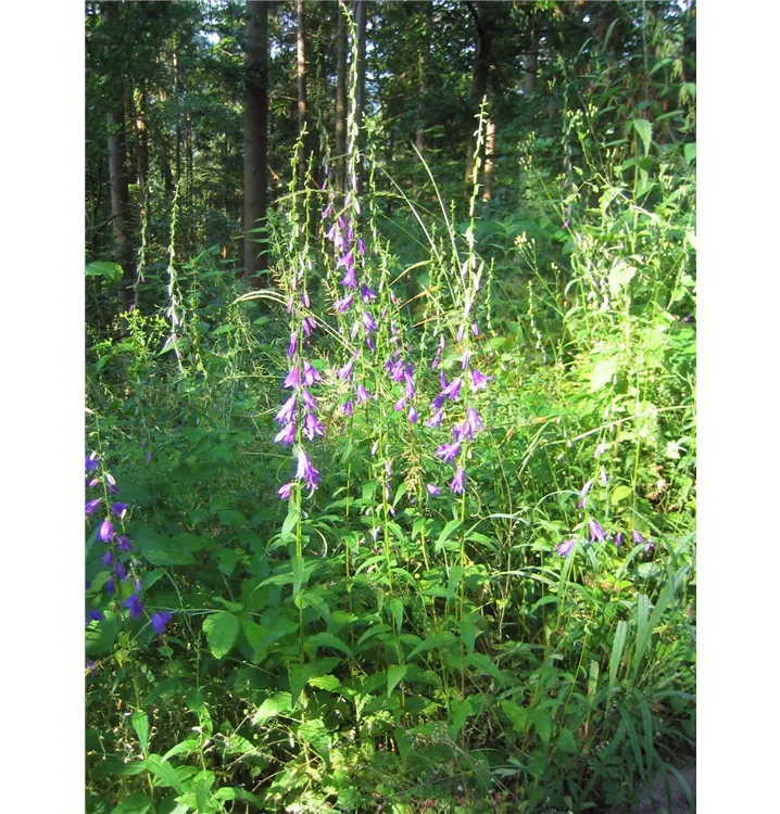 Campanula rapunculoides bildet trichterförmige, in Trauben angeordnete, violette Blüten ab Juni.