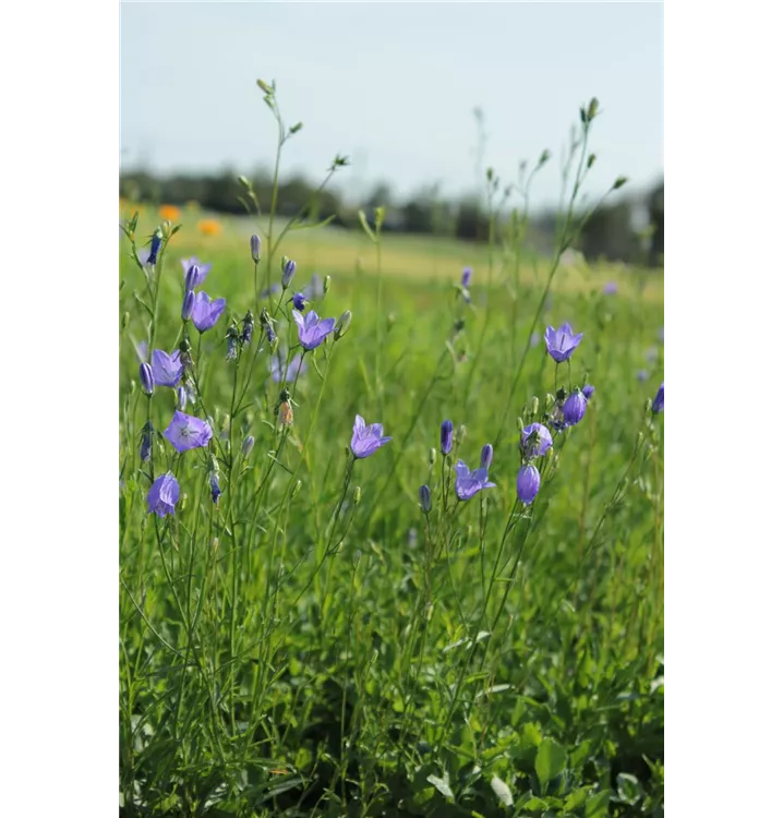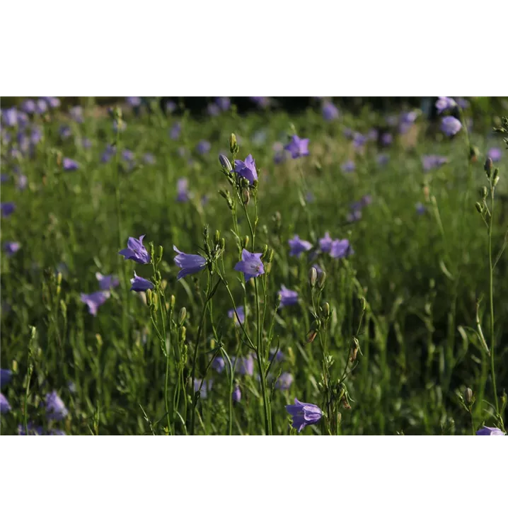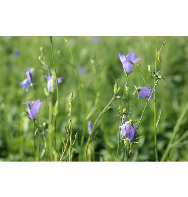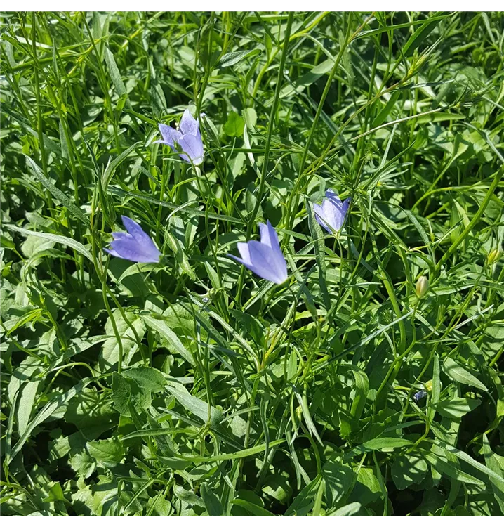 Campanula rotundifolia 'Olympica' bildet glockenförmige, in Rispen angeordnete, lilafarbene Blüten ab Mai.
