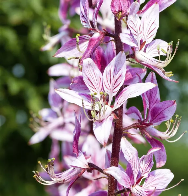 Dictamnus albus bildet in Rispen angeordnete, rosafarbene Blüten ab Juni. Diese verströmen einen angenehmen Duft.