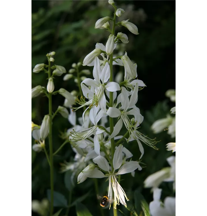 Der Weißblühende Diptam 'Albiflorus' (Dictamnus albus) ist eine aufrechte Staude, die von Juni bis Juli weiße, in Rispen angeordnete Blüten mit einem angenehmen Duft bildet. An einem sonnigen bis halbschattigen Standort mit durchlässigem, nährstoffreichem Boden erreicht er gewöhnlich eine Höhe von ca. 80 cm und wird ca. 60 cm breit. Der Weißblühende Diptam 'Albiflorus' ist gut frostverträglich.
