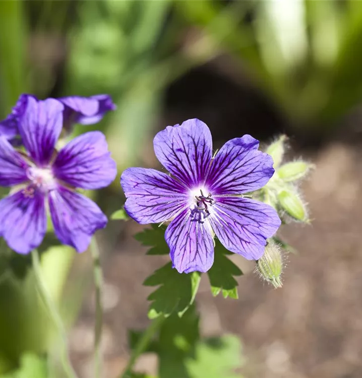 Geranium x magnificum bildet schalenförmige, blauviolette Blüten ab Mai.