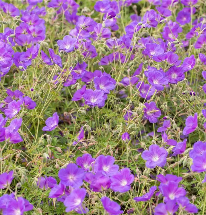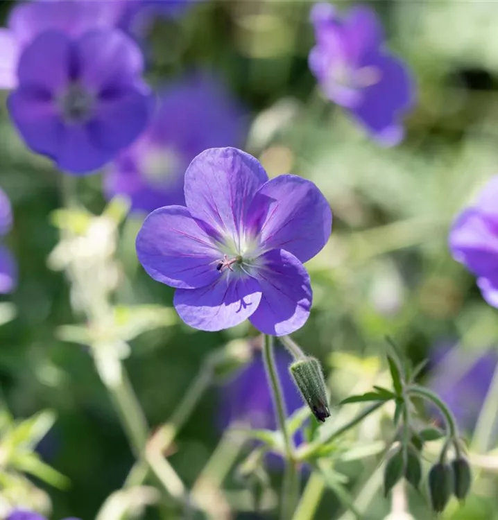 Geranium pratense 'Brookside' bildet schalenförmige, blauviolette Blüten ab Mai. Bei richtiger Pflege Nachblüte im September.