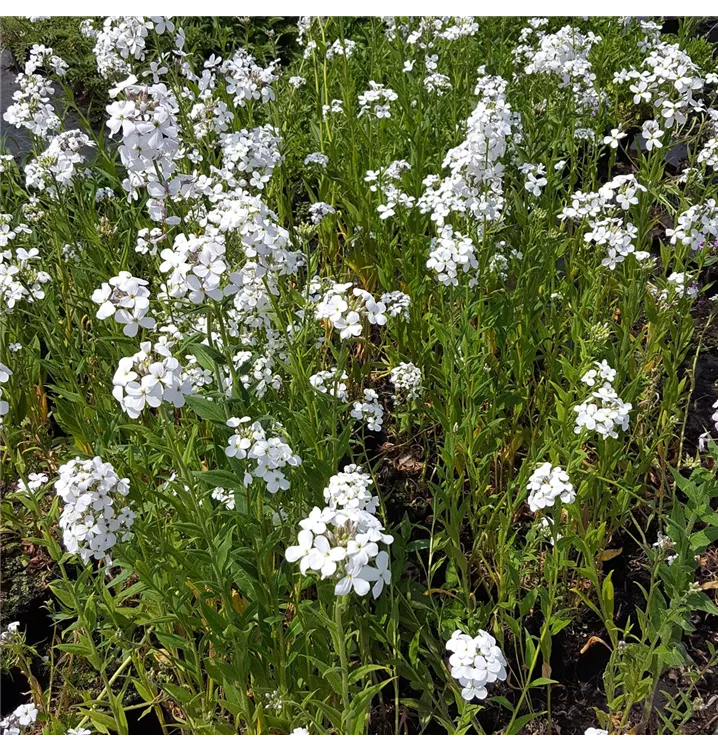 Die Garten-Nachtviole 'Alba' (Hesperis matronalis) ist eine aufrechte Staude, die von Mai bis Juli weiße, in Trauben angeordnete Blüten mit einem starken Duft bildet. An einem sonnigen bis halbschattigen Standort mit durchlässigem, humosem, lockerem, nährstoffreichem Boden erreicht sie gewöhnlich eine Höhe von ca. 70 cm und wird ca. 40 cm breit. Die Garten-Nachtviole 'Alba' ist gut frostverträglich.