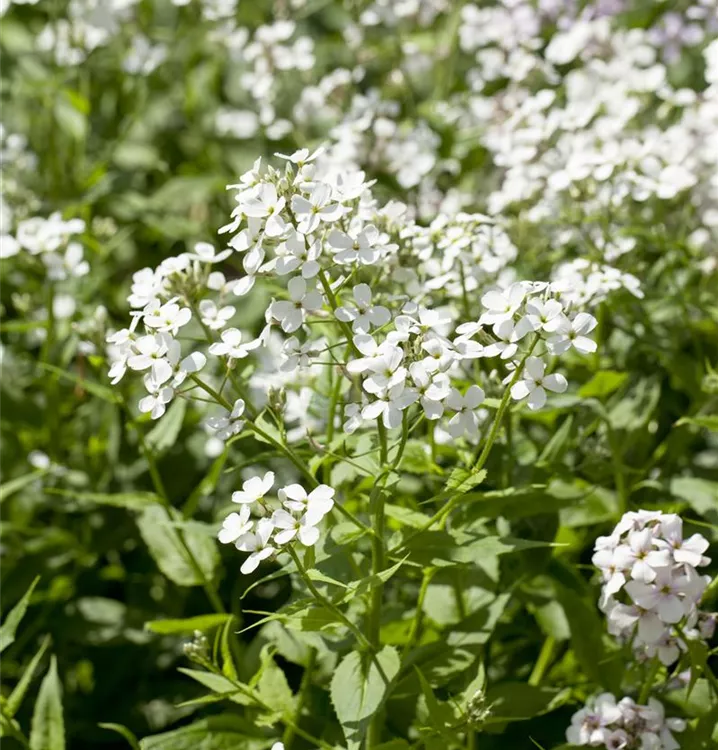 Hesperis matronalis 'Alba' bildet in Trauben angeordnete, weiße Blüten ab Mai. Diese verströmen einen starken Duft.