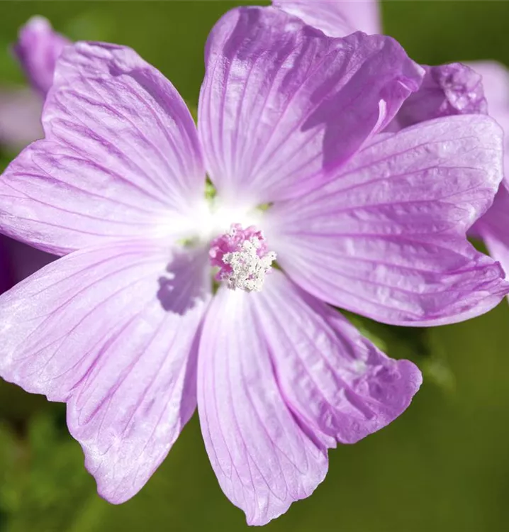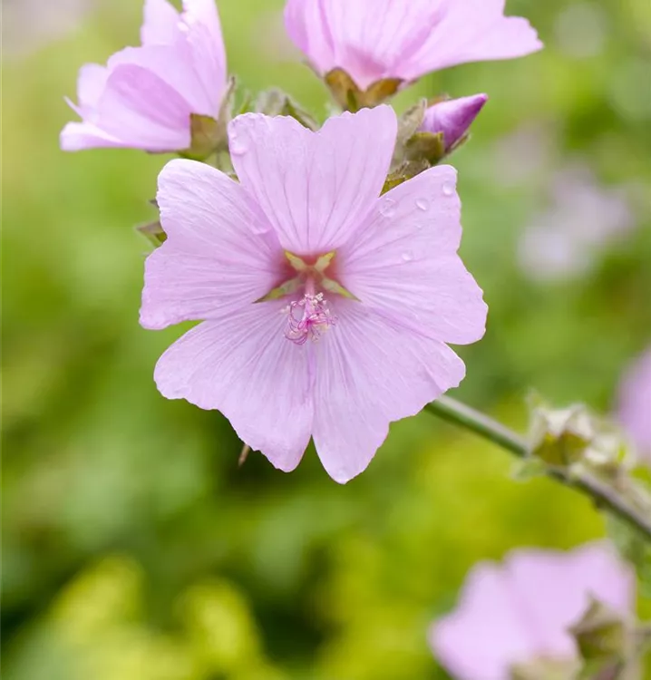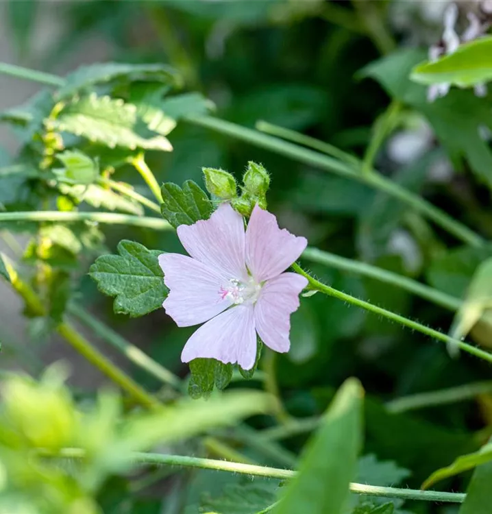 Malva moschata bildet schalenförmige, hellrosafarbene Blüten ab Juni. Diese verströmen einen angenehmen Duft.