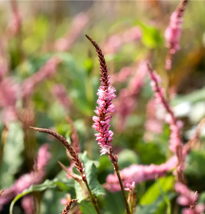 Der Garten-Kerzenknöterich 'Pink Elephant'® (Bistorta amplexicaulis) ist eine aufrechte, horstbildende Staude, die von Juli bis Oktober hellrosafarbene, in Rispen angeordnete Blüten bildet. Seine lanzettlichen Blätter sind dunkelgrün. An einem sonnigen bis halbschattigen Standort mit durchlässigem, humosem, nährstoffreichem Boden erreicht er gewöhnlich eine Höhe von ca. 60 cm und wird ca. 60 cm breit. Der Garten-Kerzenknöterich 'Pink Elephant'® ist gut frostverträglich.