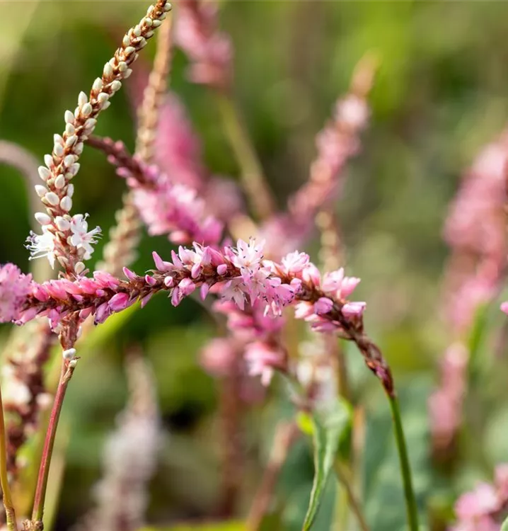 Der Garten-Kerzenknöterich 'Pink Elephant'® (Bistorta amplexicaulis) ist eine aufrechte, horstbildende Staude, die von Juli bis Oktober hellrosafarbene, in Rispen angeordnete Blüten bildet. An einem sonnigen bis halbschattigen Standort mit durchlässigem, humosem, nährstoffreichem Boden erreicht er gewöhnlich eine Höhe von ca. 60 cm und wird ca. 60 cm breit. Der Garten-Kerzenknöterich 'Pink Elephant'® ist gut frostverträglich.