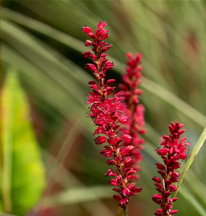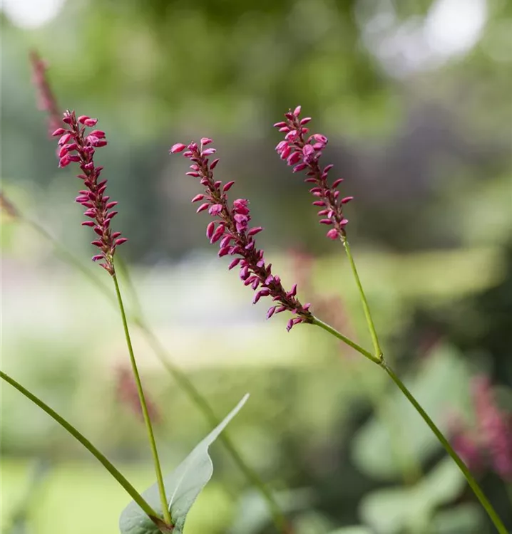 Bistorta amplexicaulis 'Speciosa' bildet in Rispen angeordnete, scharlachrote Blüten ab August.