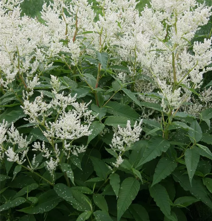 Aconogonon speciosum 'Johanniswolke' bildet in Rispen angeordnete, weiße Blüten ab Juni.