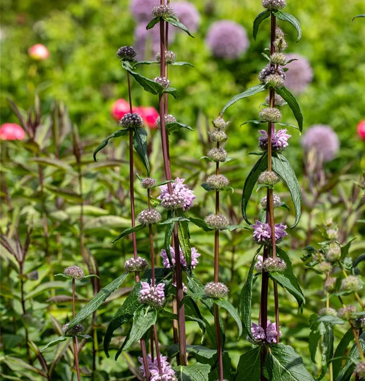 Phlomis tuberosa 'Amazone' bildet in Quirlen angeordnete, rosafarbene Blüten ab Juni.