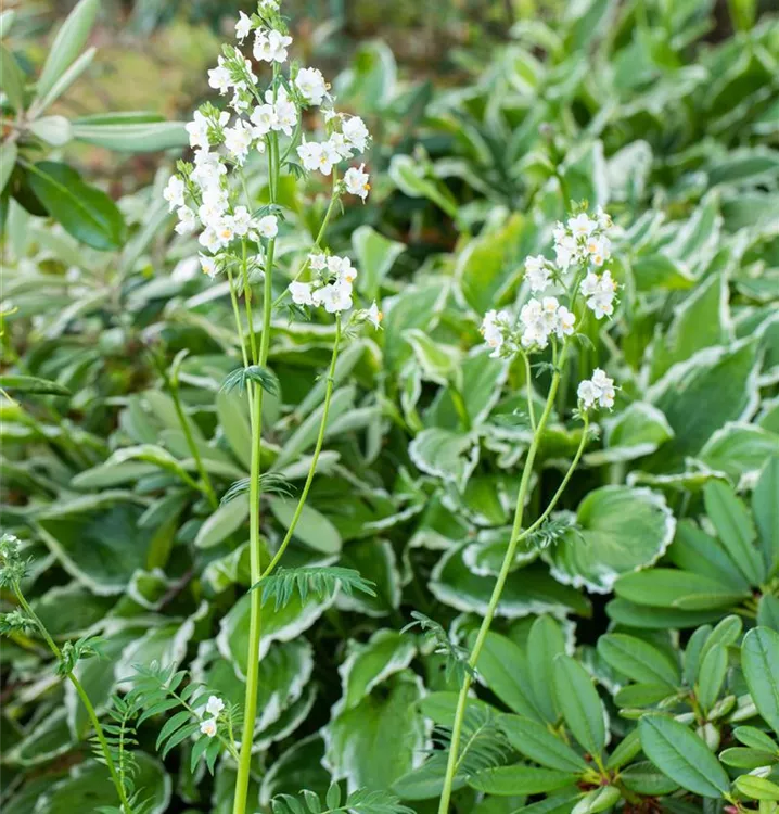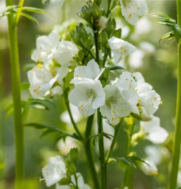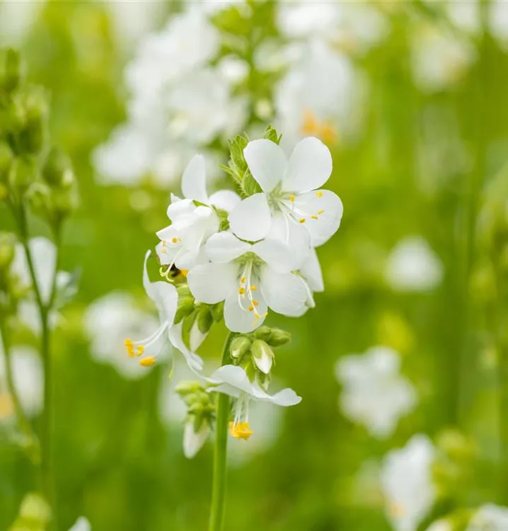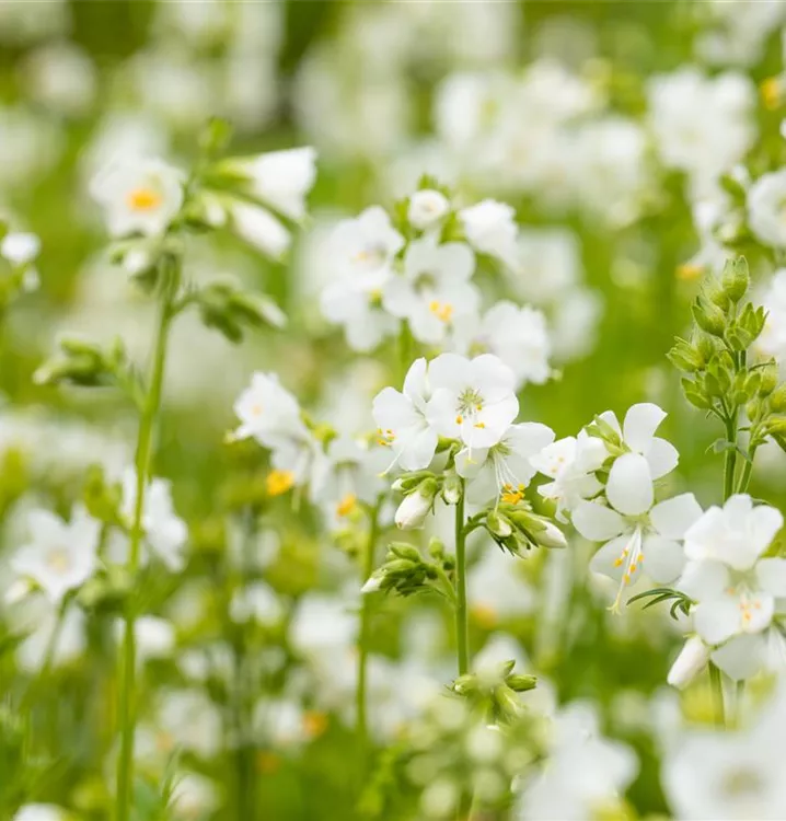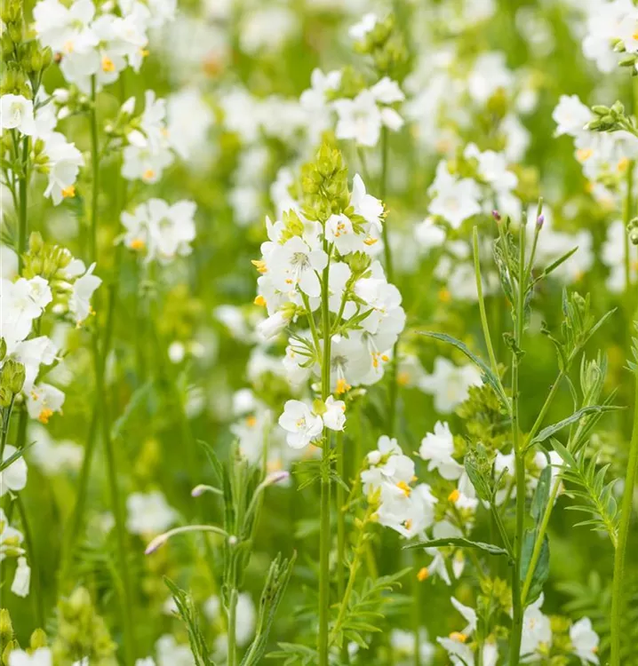 Polemonium caeruleum 'Album' bildet trichterförmige, weiße Blüten ab Mai. Diese verströmen einen angenehmen Duft. Bei richtiger Pflege Nachblüte von Juli bis August.