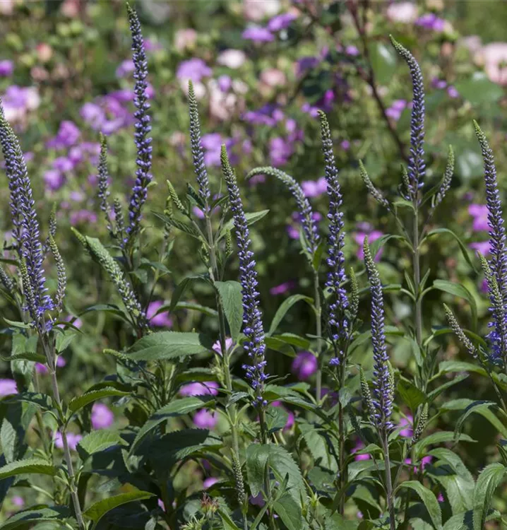 Veronica spicata bildet rachenförmige, in Ähren angeordnete, blaue Blüten ab Juni.