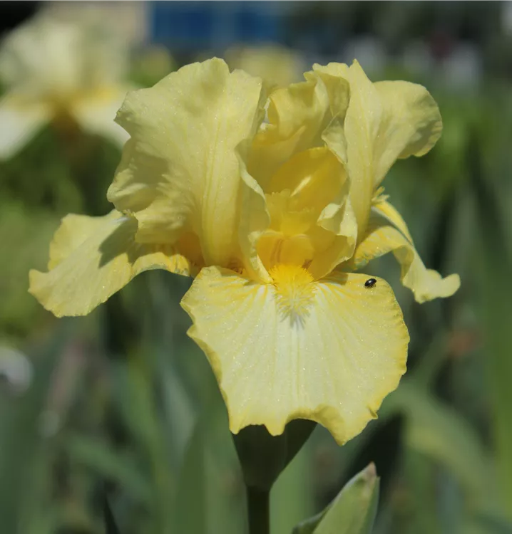 Die Hohe Bart-Iris 'Maui Moonlight' (Iris x barbata-elatior 'Maui Moonlight') blüht im Mai und Juni. Die Blüten Sind hellgelb (Bitone), die Hängeblätter sind heller und gelb geadert, der Bart ist gelb. Wird bis zu 90 cm hoch. Züchter: Aitken, 1987