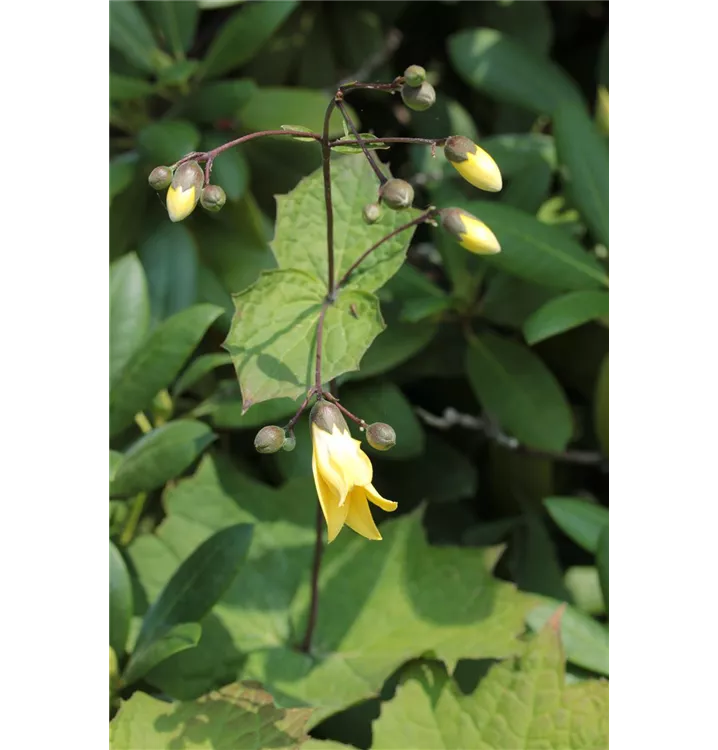 Kirengeshoma palmata bildet glockenförmige, zitronengelbe Blüten ab August.