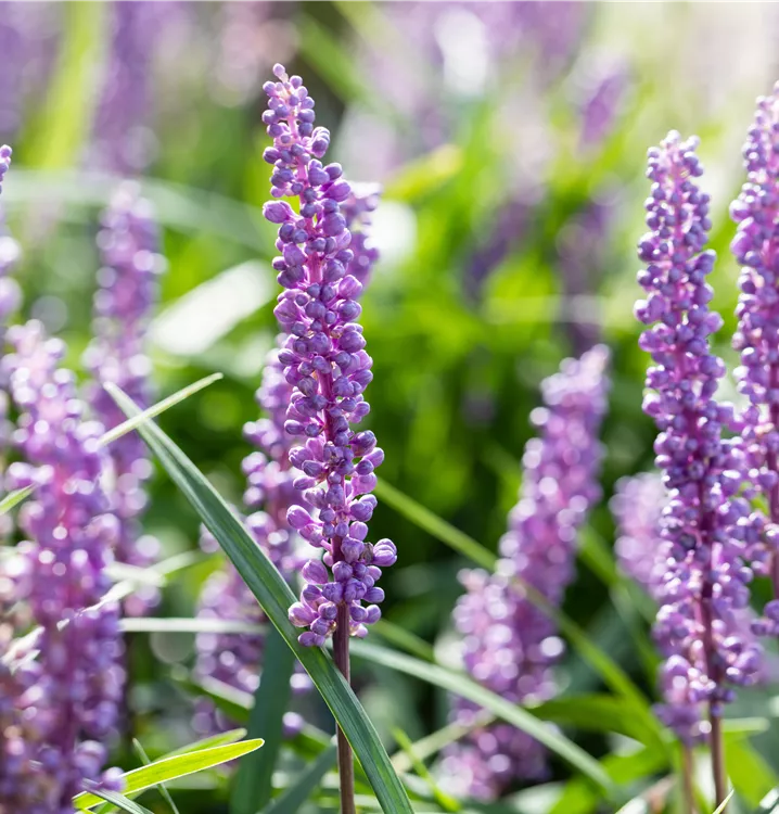 Liriope muscari 'Big Blue' bildet glockenförmige, in Rispen angeordnete, blaue Blüten ab August.