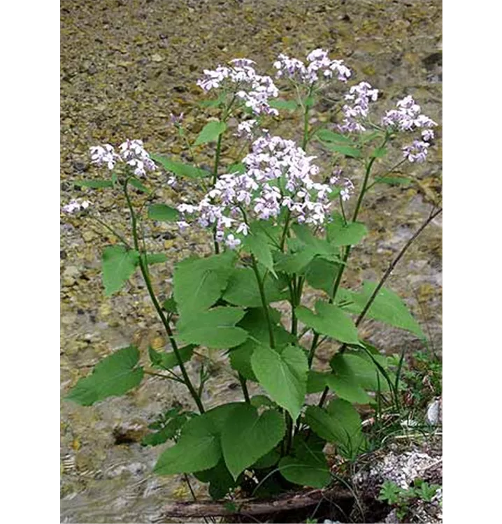 Das Ausdauernde Silberblatt (Lunaria rediviva) ist eine aufrechte Staude, die von Mai bis Juli lilafarbene, in Dolden angeordnete Blüten mit einem starken Duft bildet. Aus den Blüten entwickeln sich zu August dekorative, silbrige Früchte. Seine herzförmigen Blätter sind mittelgrün. An einem halbschattigen bis schattigen Standort mit durchlässigem Boden erreicht es gewöhnlich eine Höhe von ca. 90 cm und wird ca. 50 cm breit. Das Ausdauernde Silberblatt ist gut frostverträglich.