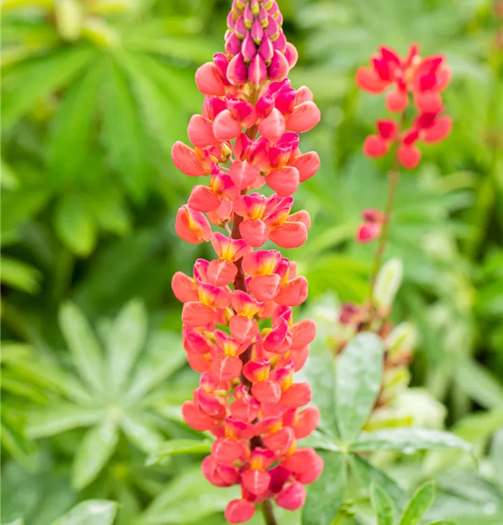 Lupinus polyphyllus 'Edelknabe' bildet schmetterlingsförmige, karminrote Blüten ab Juni. Diese verströmen einen angenehmen Duft.