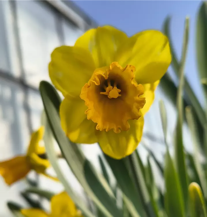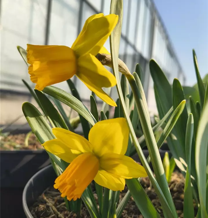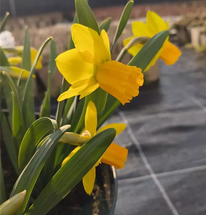 Die Wildform stammt ursprünglich von der iberischen Halbinsel, wo sie auf sonnigen Bergwiesen wächst. Die Sorte 'Jetfire' bleibt mit etwa 20 bis 25 cm Höhe schön kompakt. Ihre Blütezeit liegt im März und April. Besonders auffällig sind die stark zurückgebogenen Kronblätter, die ihr das typische „Alpenveilchen“-Aussehen verleihen. Die Blüten sind goldgelb, die Trompete leuchtet gelb-orange.