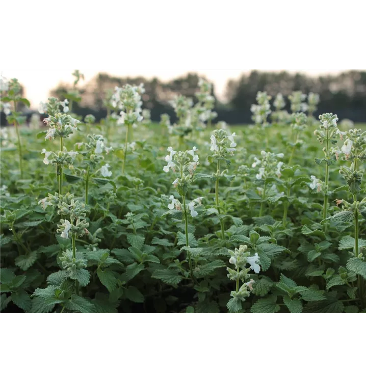 Nepeta racemosa 'Snowflakes' bildet lippenförmige, in Quirlen angeordnete, weiße Blüten ab Mai. Diese verströmen einen angenehmen Duft. Bei richtiger Pflege Nachblüte im September.