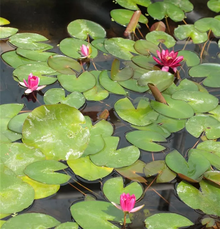 Wir kultivieren Seerosen aus praktischen Gründen bei geringer Wassertiefe. Im heimischen Teich sollten Seerosen langsam an tiefere Zonen gewöhnt werden: Anfangs nur so tief, dass die Blätter etwa 10 cm unter Wasser sind. Sobald die Blätter nachgewachsen sind und auf der Wasseroberfläche schwimmen, kann sie ein Stück tiefer gesetzt werden. Das wiederholt man bis zur gewünschten Pflanztiefe. Die Pflanzzeit für Seerosen ist von April bis Ende Juli/Anfang August.