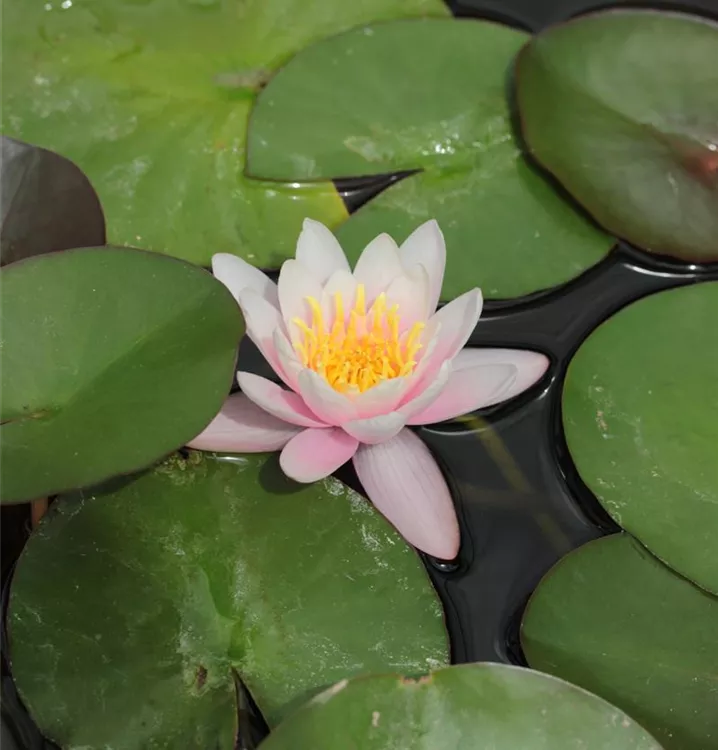 Wir kultivieren Seerosen aus praktischen Gründen bei geringer Wassertiefe. Im heimischen Teich sollten Seerosen langsam an tiefere Zonen gewöhnt werden: Anfangs nur so tief, dass die Blätter etwa 10 cm unter Wasser sind. Sobald die Blätter nachgewachsen sind und auf der Wasseroberfläche schwimmen, kann sie ein Stück tiefer gesetzt werden. Das wiederholt man bis zur gewünschten Pflanztiefe. Die Pflanzzeit für Seerosen ist von April bis Ende Juli/Anfang August.