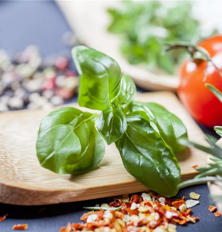 Das Basilikum (Ocimum basilicum) ist eine Kräuterpflanze mit einem würzigen Geschmack. Seine mittelgrünen Blätter sind eiförmig und gewellt. Für das optimale Wachstum des Basilikums werden ein sonniger Standort und durchlässiger, nährstoffreicher Boden benötigt.