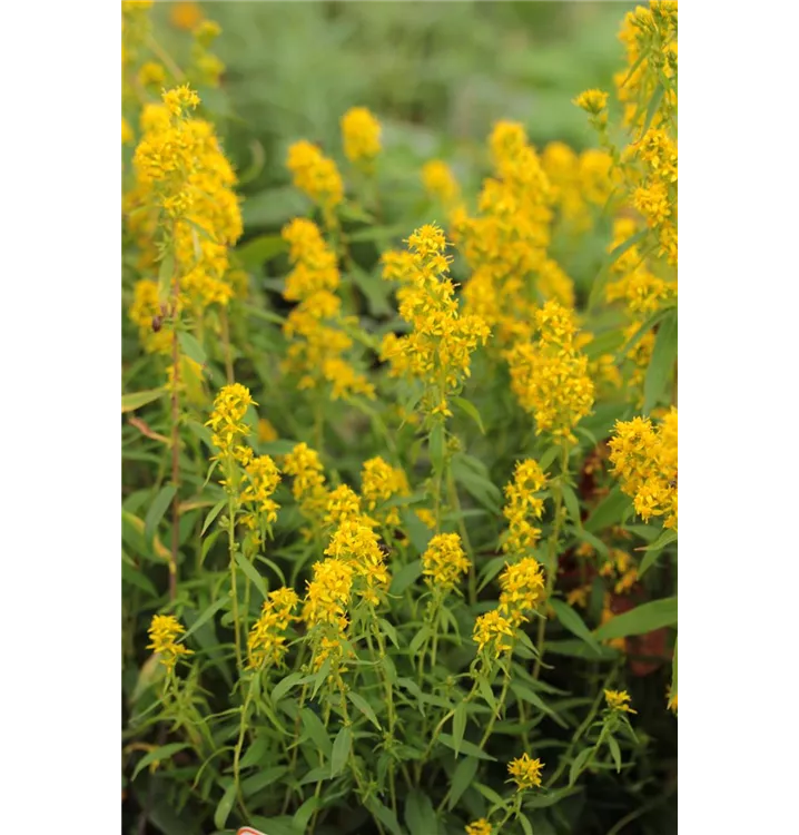Solidago caesia bildet in Rispen angeordnete, gelbe Blüten ab September.
