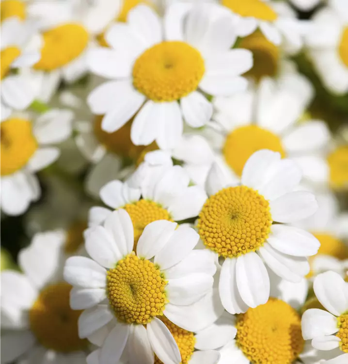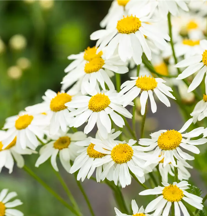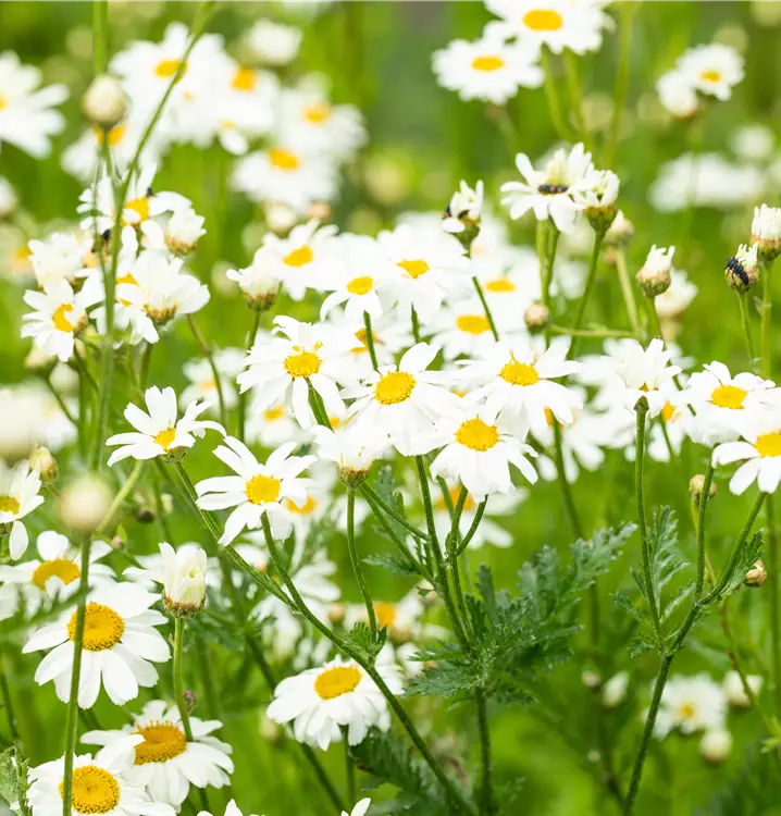 Die Strauß-Margerite (Tanacetum corymbosum) ist eine Staude, die von Juni bis Juli weiße mit gelber Mitte Blüten bildet. An einem sonnigen bis halbschattigen Standort mit durchlässigem, kalkhaltigem, lockerem Boden erreicht sie gewöhnlich eine Höhe von ca. 1 m. Die Strauß-Margerite ist gut frostverträglich.