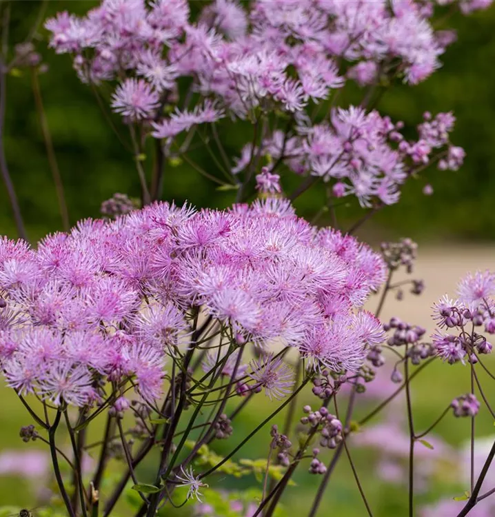 Thalictrum aquilegifolium 'Black Stockings' bildet in Rispen angeordnete, rosafarbene Blüten ab Mai.